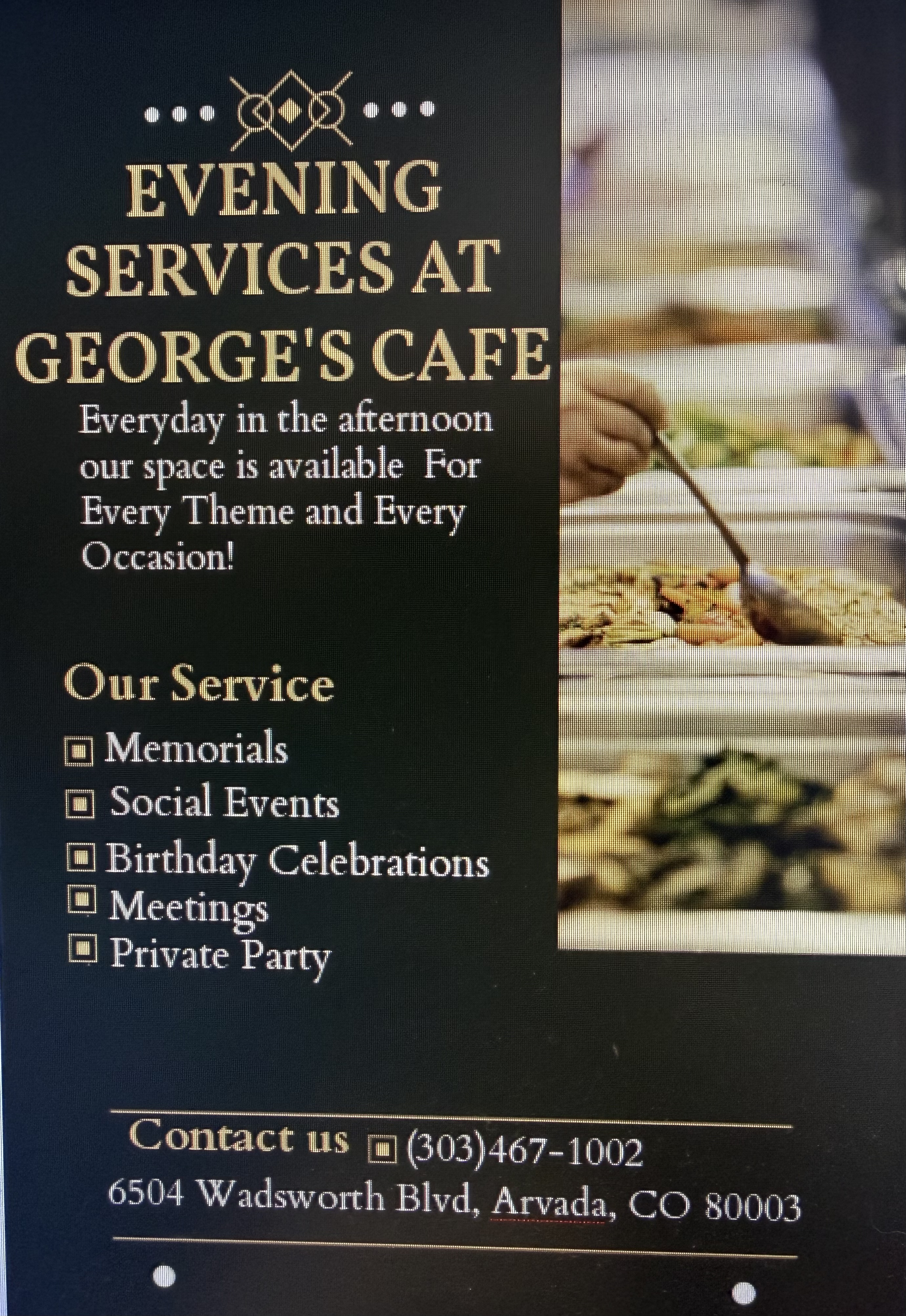 In the evenings, our historic space is available exclusively for private gatherings. • Memorial Gatherings • Birthday Celebrations • Club & Community Meetings • Rehearsal Dinners • Private Parties • Corporate Events Available after 4:00 PM Customized menus available Call (303) 467-1002